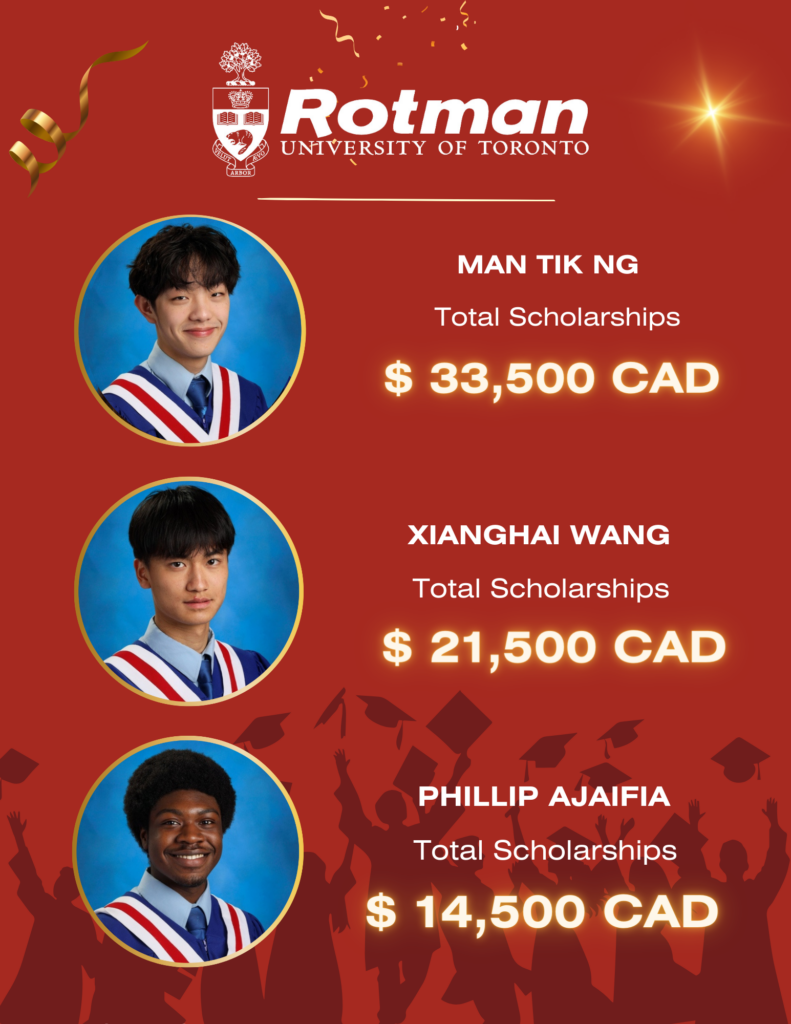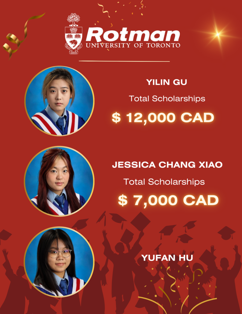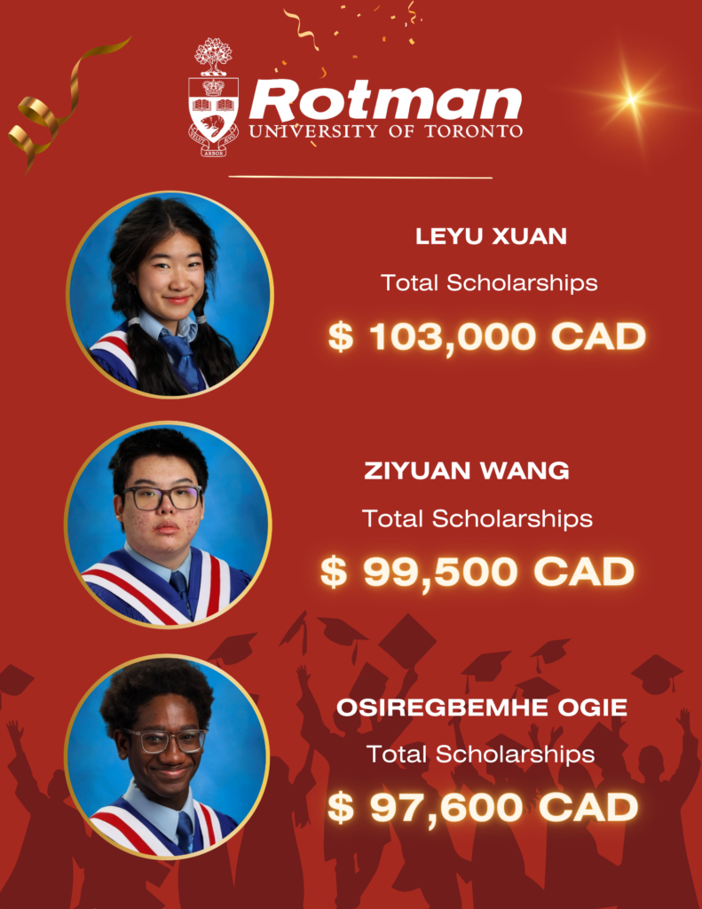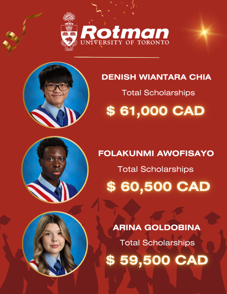 We’re thrilled to announce that 27 of our Class of 2024 graduates have been admitted to the University of Toronto’s Rotman School of Business – one of Canada’s finest! Congratulations to these bright minds on their incredible achievements!