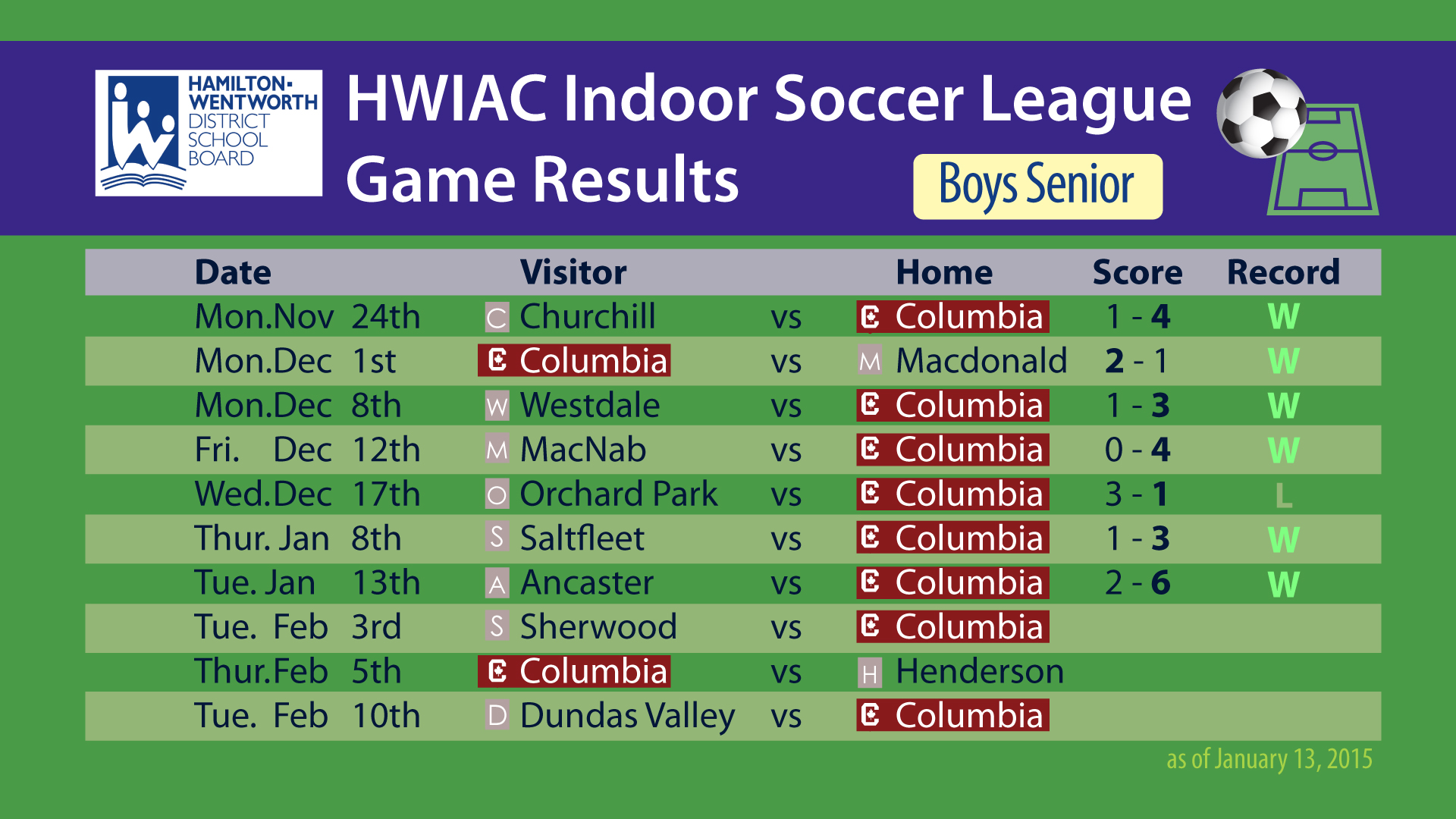 HWIAC Indoor League Columbia has been participated in the indoor athletic program with the Hamilton-Wentworth District School Board for several years now. They are one of 12 teams represented in the league.