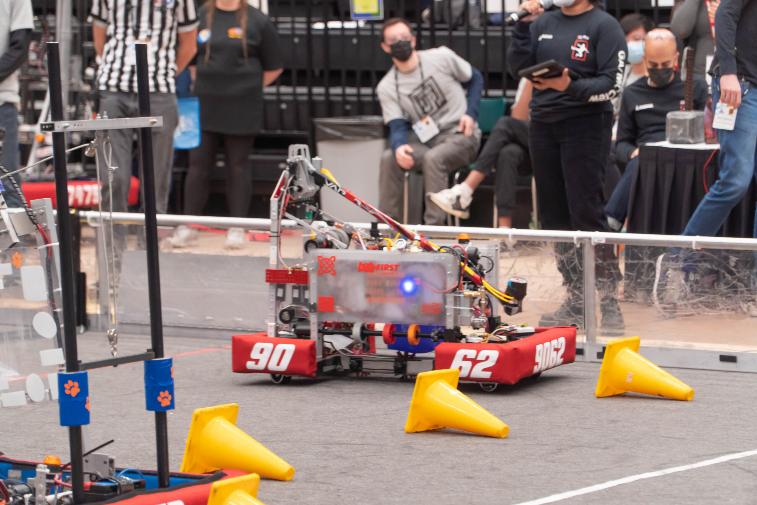 The challenge in this annual game was to pick up traffic cones and place them onto pegs; the smaller objective was to pick up inflatable cubes and place them onto shelves 4 feet away from where the robots were allowed to go.