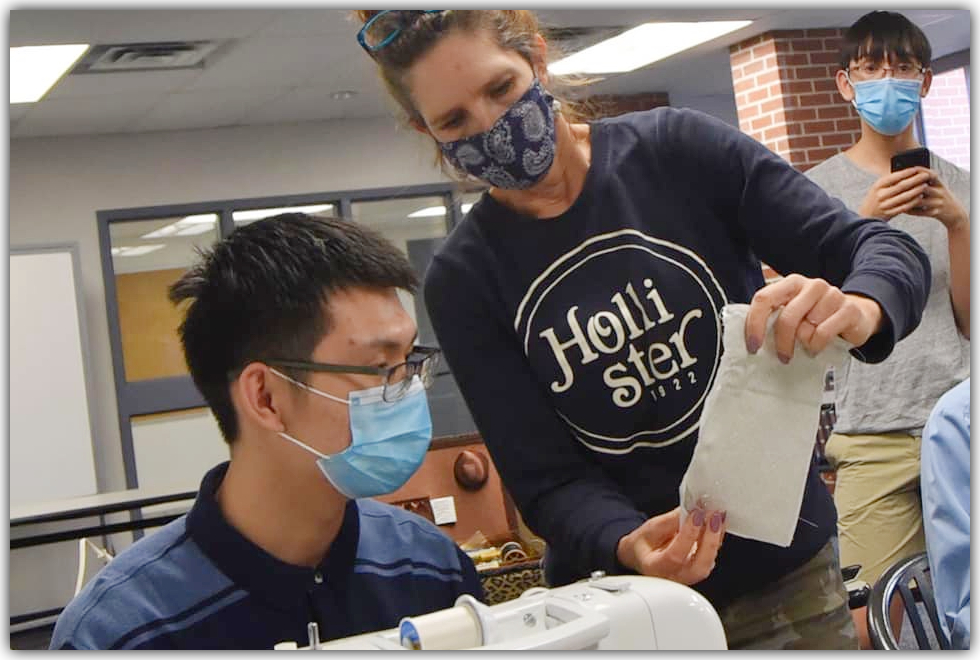 Students in the Sewing Club are having fun making their own fabric masks using a sewing machine.