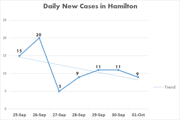 The first graph represents the daily new cases and trend in the City of Hamilton