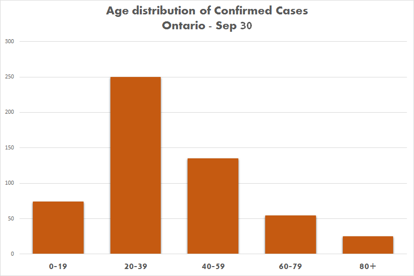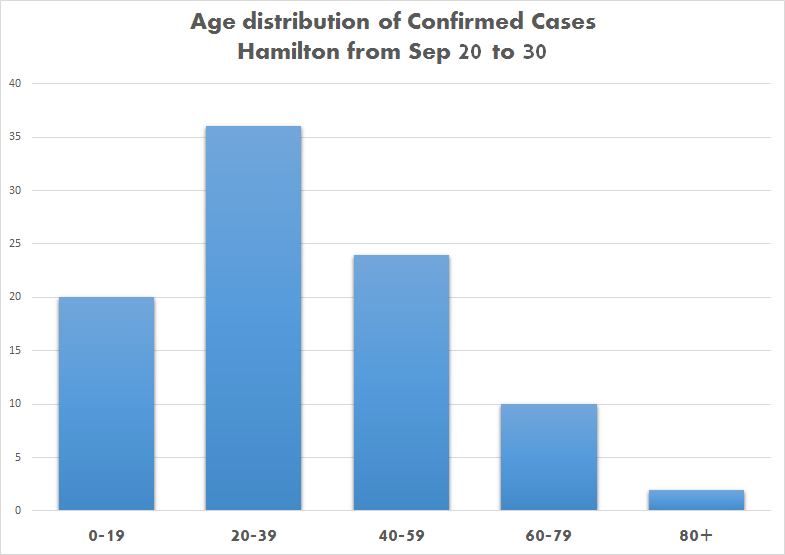 The graph below shows the age distribution of confirmed cases in Hamilton from September 20 to 30. The most affected age groups are:- 20 to 39 age group