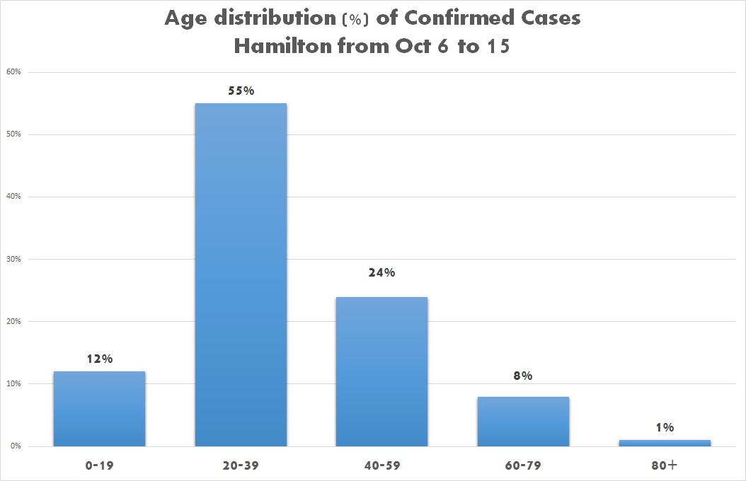 The graph below shows the age distribution (%) of confirmed cases in Hamilton from October 6 to 15. The most affected age groups continue to be:- 20 to 39 age group