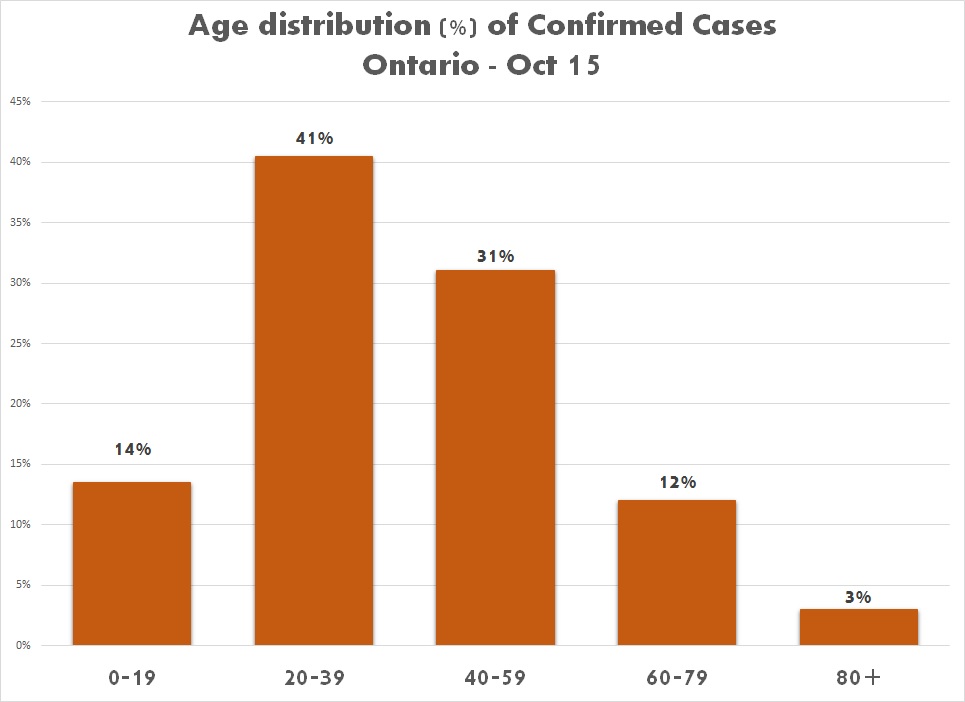 The graph below shows the age distribution (%) of confirmed cases in Ontario on October 15. The most affected age groups remain as following:- 20 to 39 age group