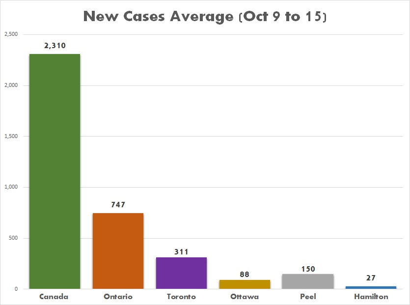 Prime Minister Justin Trudeau recognized it is necessary to get the situation under control especially with the approach of the winter and the flu season. The graph below shows the average of new cases from October 9 to 15 in: