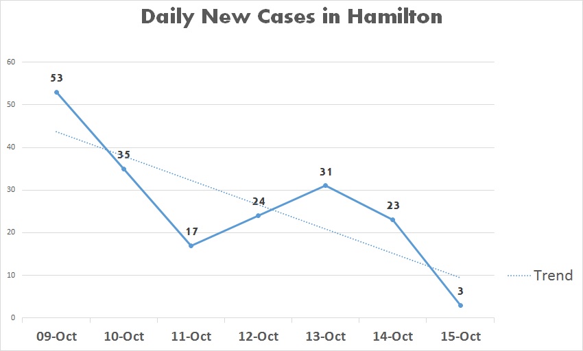 The graph below represents the daily new cases and trend in the City of Hamilton- from October 9 to 15