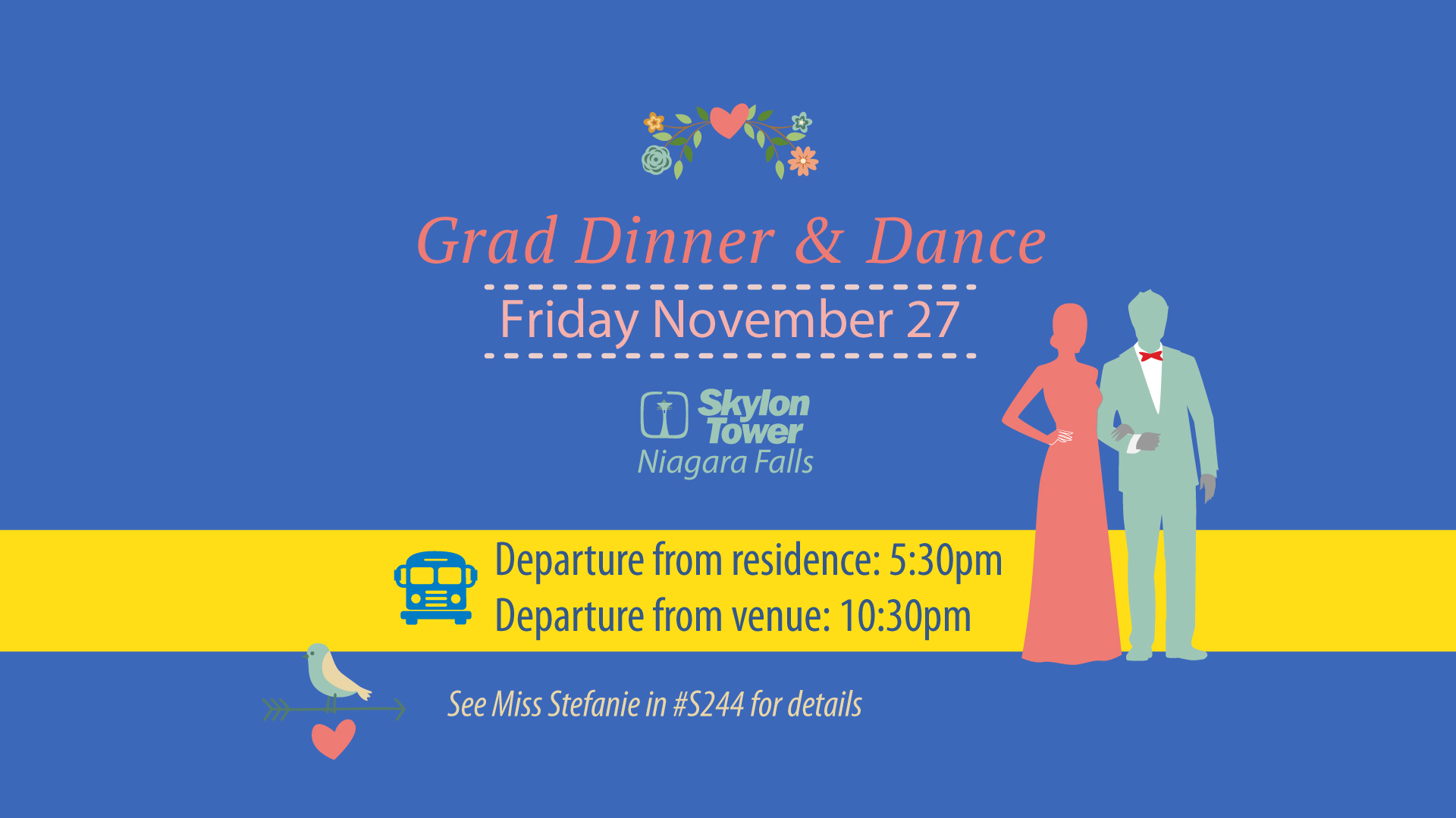 Held at the Skylon Tower in Niagara Falls, December graduates will enjoy a night of dinner and dancing. They will also be treated to a special fireworks display over Niagara Falls later in the evening. The dinner is scheduled for Friday, November 27, 2015. Students will leave residence at 5:30pm.