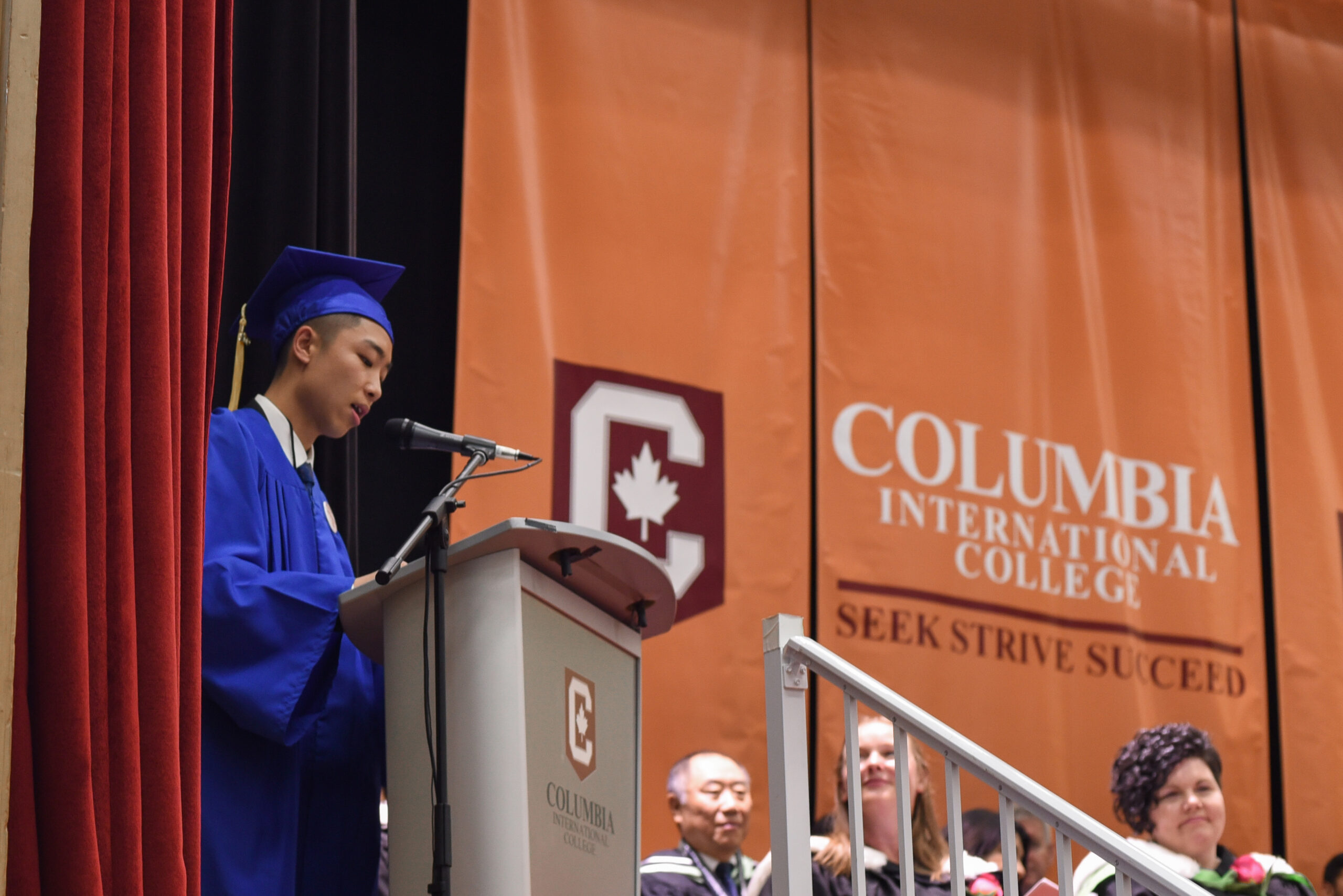 Jackie Zhan graced the stage as Valedictorian and spoke with remarkable insight. He spoke from the heart, thanking all departments and staff for every bit of help they have provided to the students of CIC. From Campus Security, Maintenance, Academics and more – every department at CIC has helped in some way in fostering the success of the students. When Jackie first arrived to Columbia International College in March 2018, he was making an incredible effort to get involved by bringing the students together and developed his leadership skills. Throughout his time here, Jackie motivated his peers, engaged quieter students and created an inclusive environment with his positive attitude. In his speech, Jackie gave a message to all students to keep working hard for their goals and to push themselves to be the best person they can be. With an average of 96%, Jackie is one of CIC’s top graduates and was voted this year’s Valedictorian.