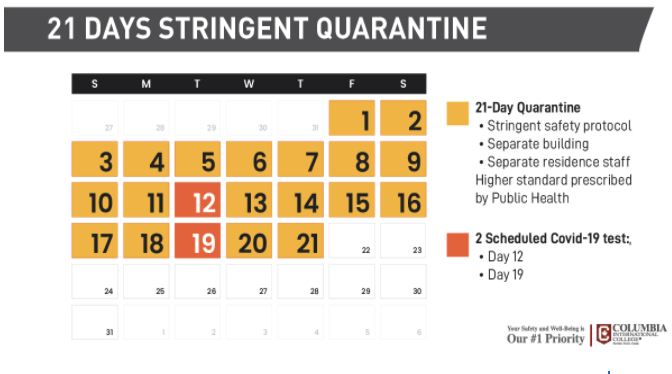 CIC has a dedicated quarantine residence and strict 21-day quarantine protocols for both new students arriving from overseas and those checking back into residence.