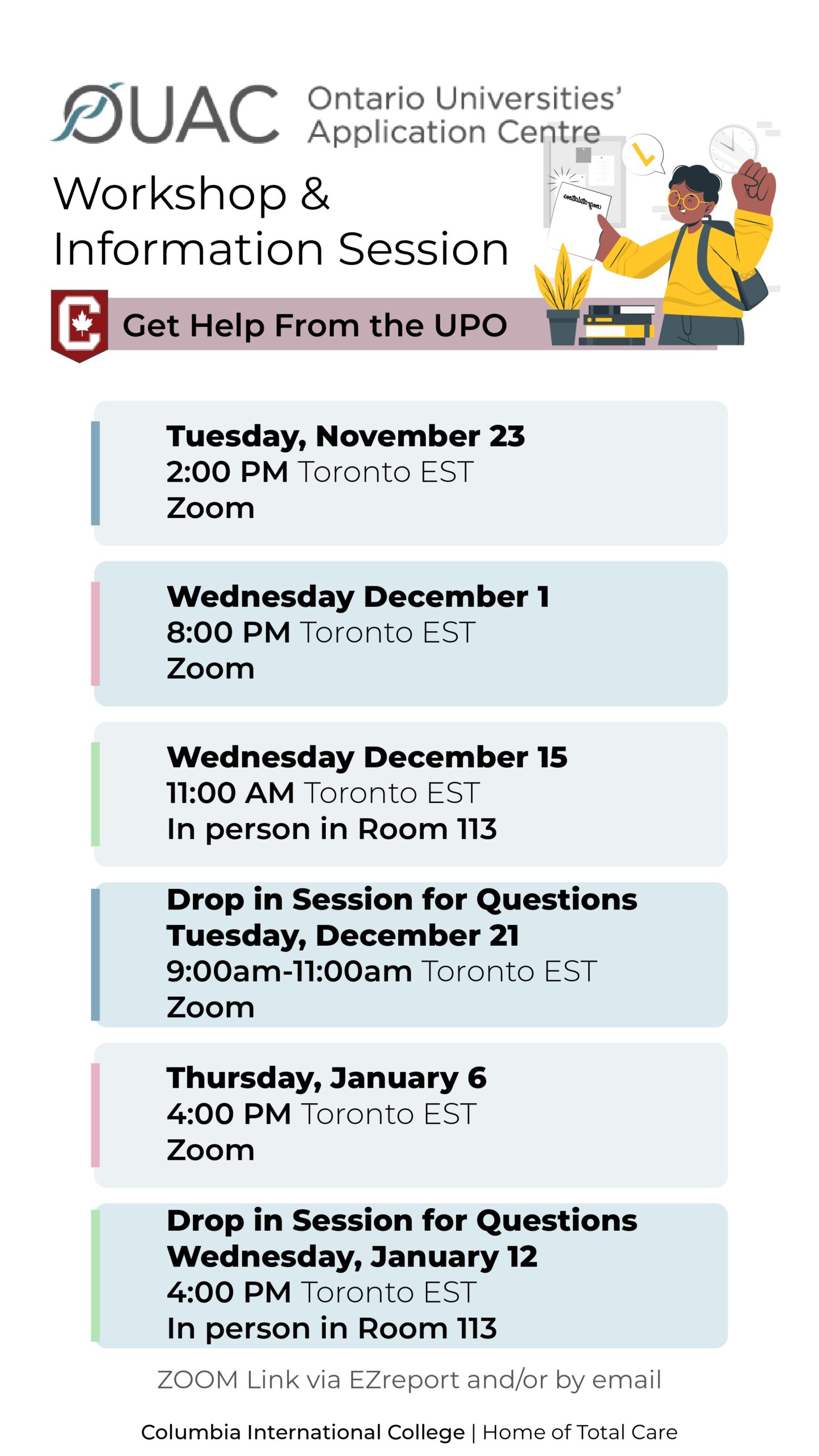 Our University Placement Counsellors will be running virtual and in-person workshops and sessions during the holiday break.  Students are encouraged to join in to go through the Ontario University application process and ask any questions.