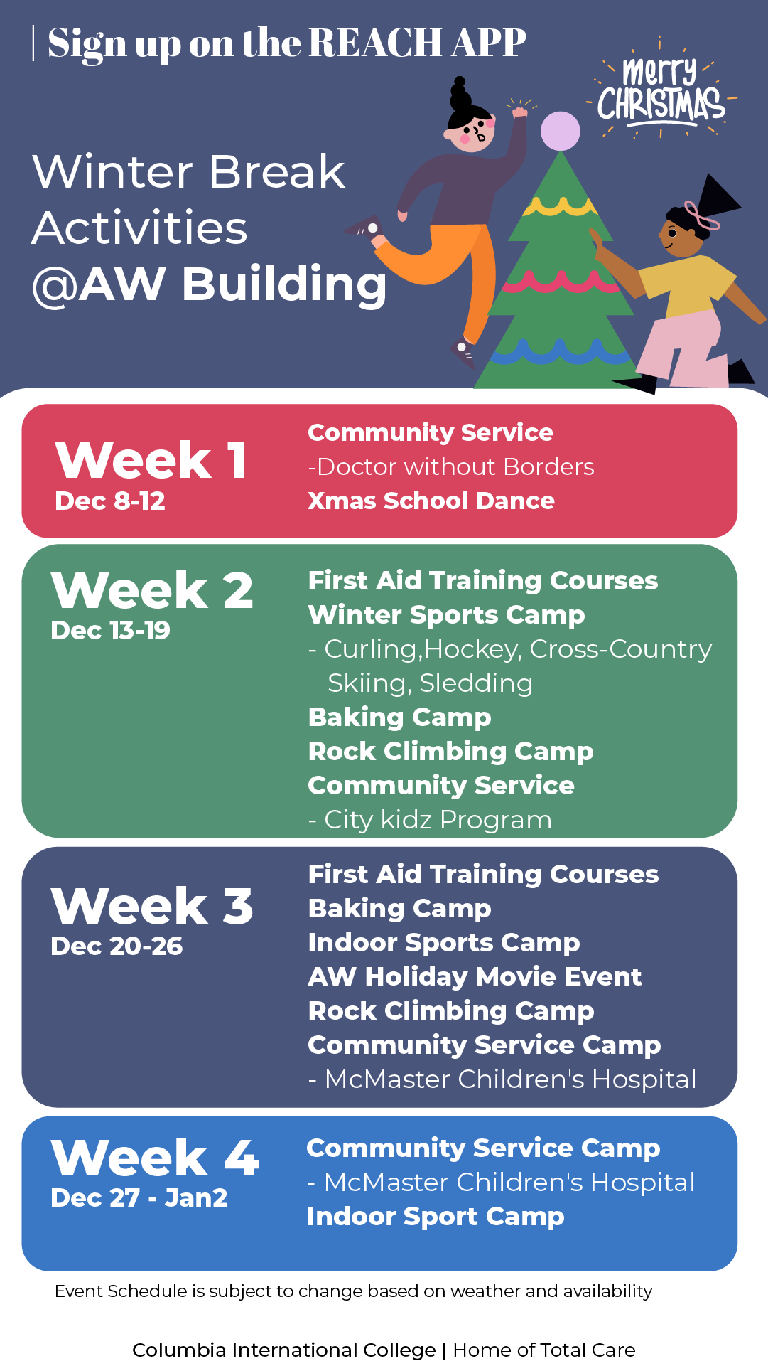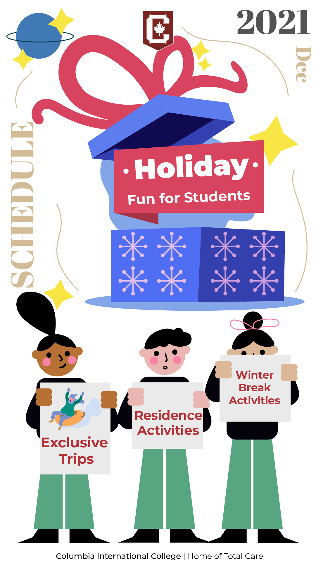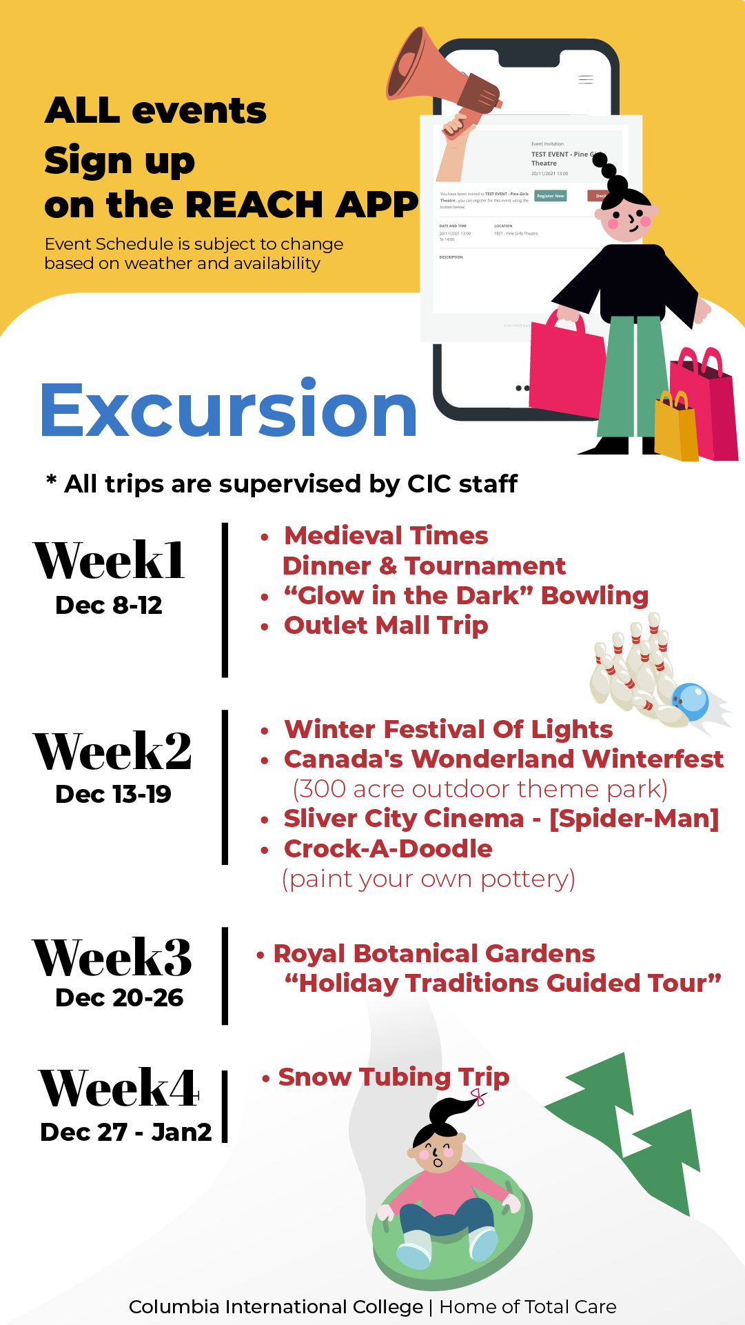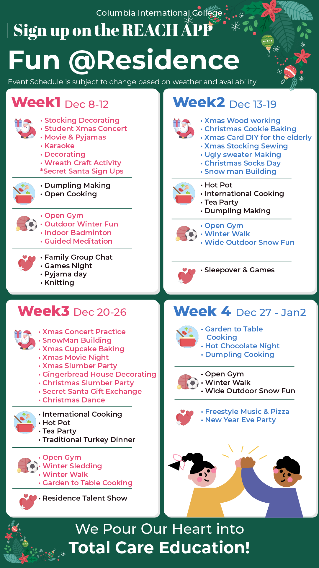 We are officially releasing the 2021 Holiday Calendar.   There are plenty of opportunities to socialize, have fun and enjoy the Winter break in Canada. Students can enjoy a variety of options from Snowtubing, our Winter Festival,  to First Aid Training, Community Service Events and University Application workshops.   Sign-up starts on Monday, November 29th at 12:00pm on REACH APP.   Enjoy time with friends during the holiday break in our Residences and have a Canadian winter experience by joining holiday-related activities and events. The break will also be an opportunity for personal development and training.  The Winter Break trips, events and activities will run from December 8, 2021, to January 2nd, 2022.   See the complete Calendar here.