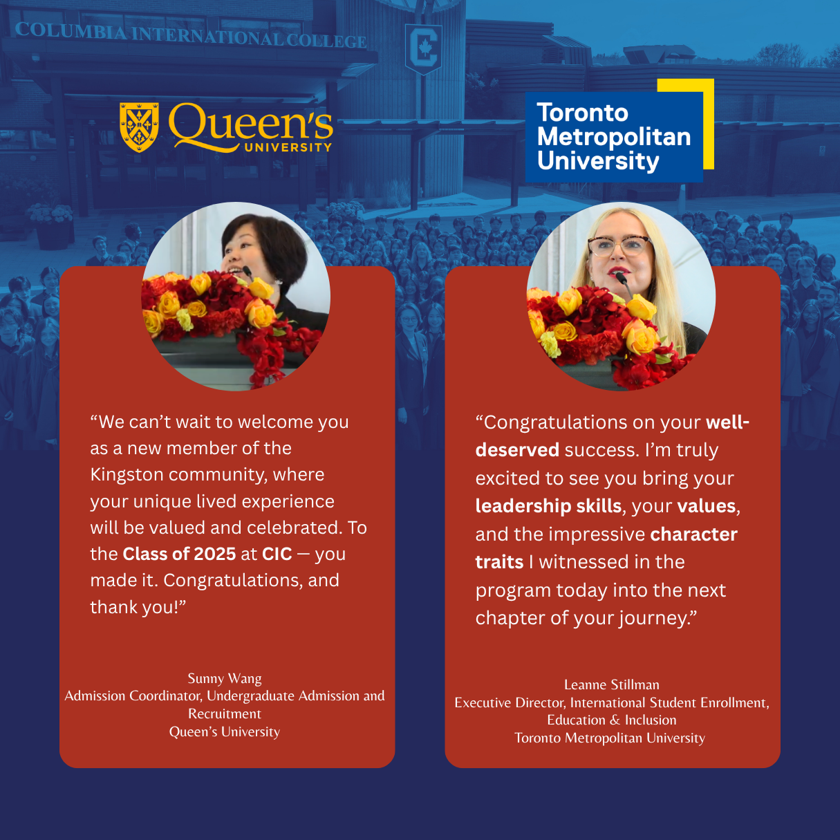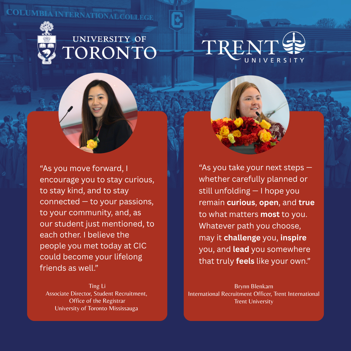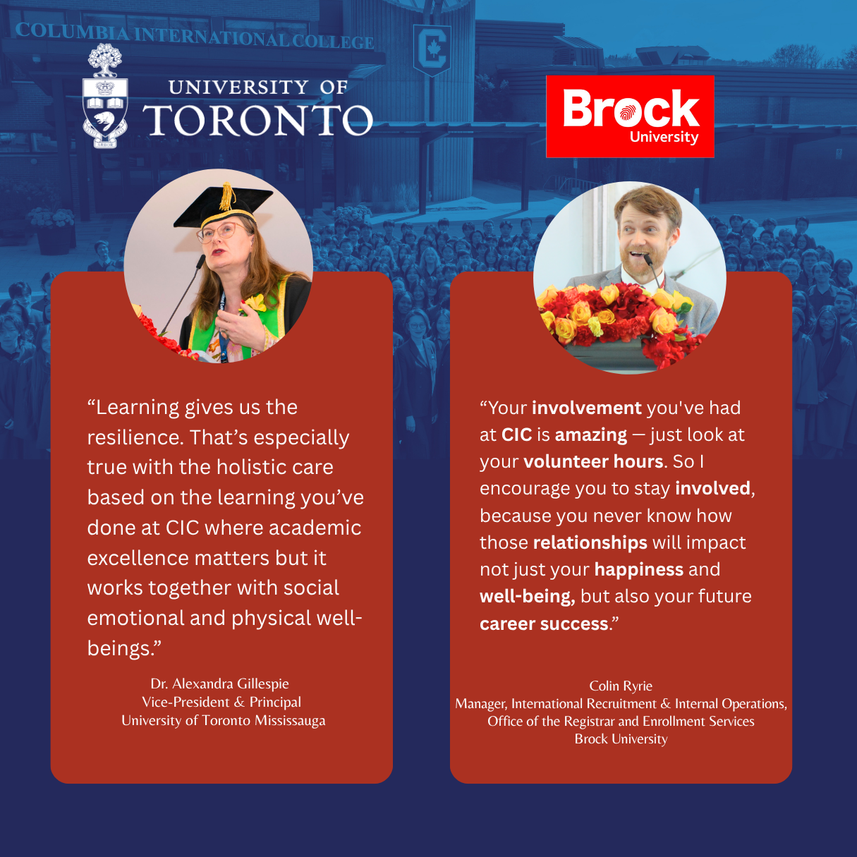 At Columbia International College’s May 2025 graduation ceremony, we were honored to welcome our distinguished guest speaker, Dr. Alexandra Gillespie, Vice-President of the University of Toronto and President of the U of T Mississauga Campus, along with admissions representatives from over a dozen of Canada’s top universities and community colleges. Their presence underscored strong support for CIC and our graduating class.