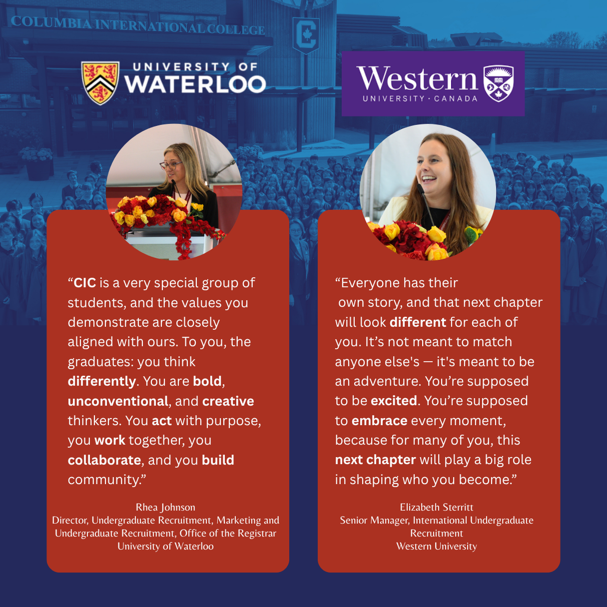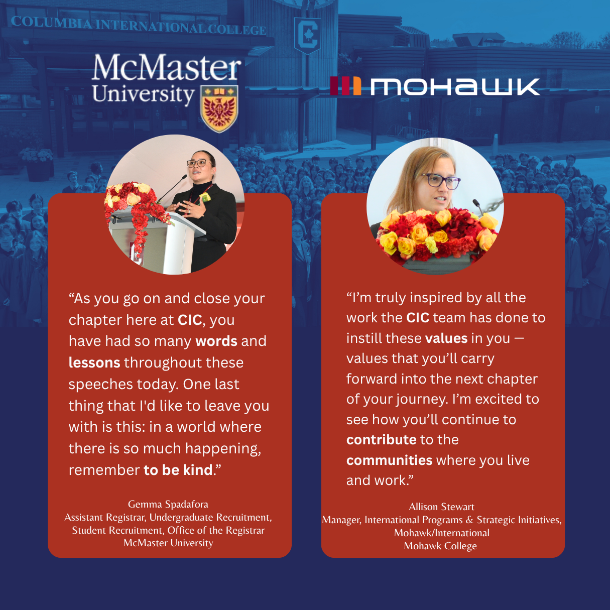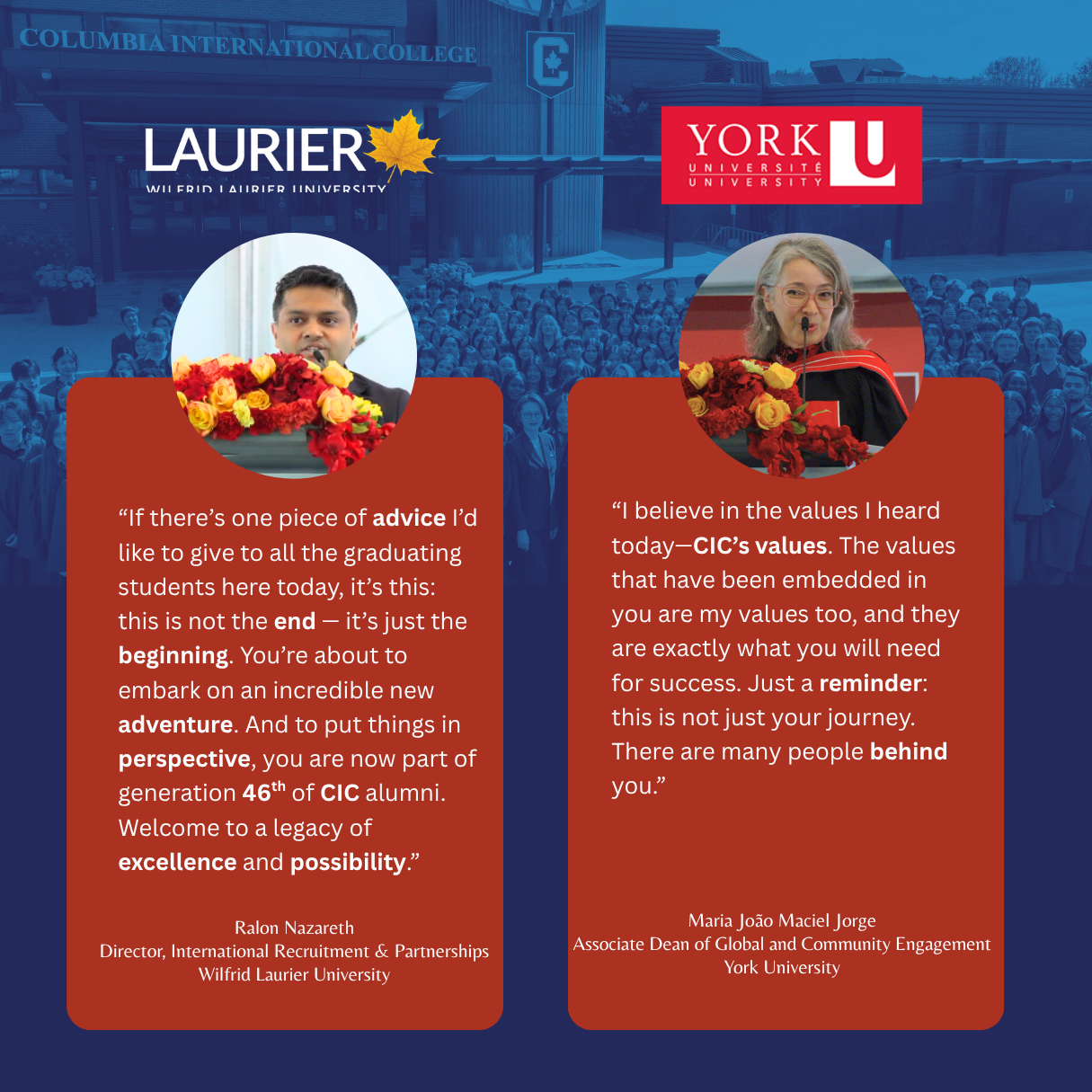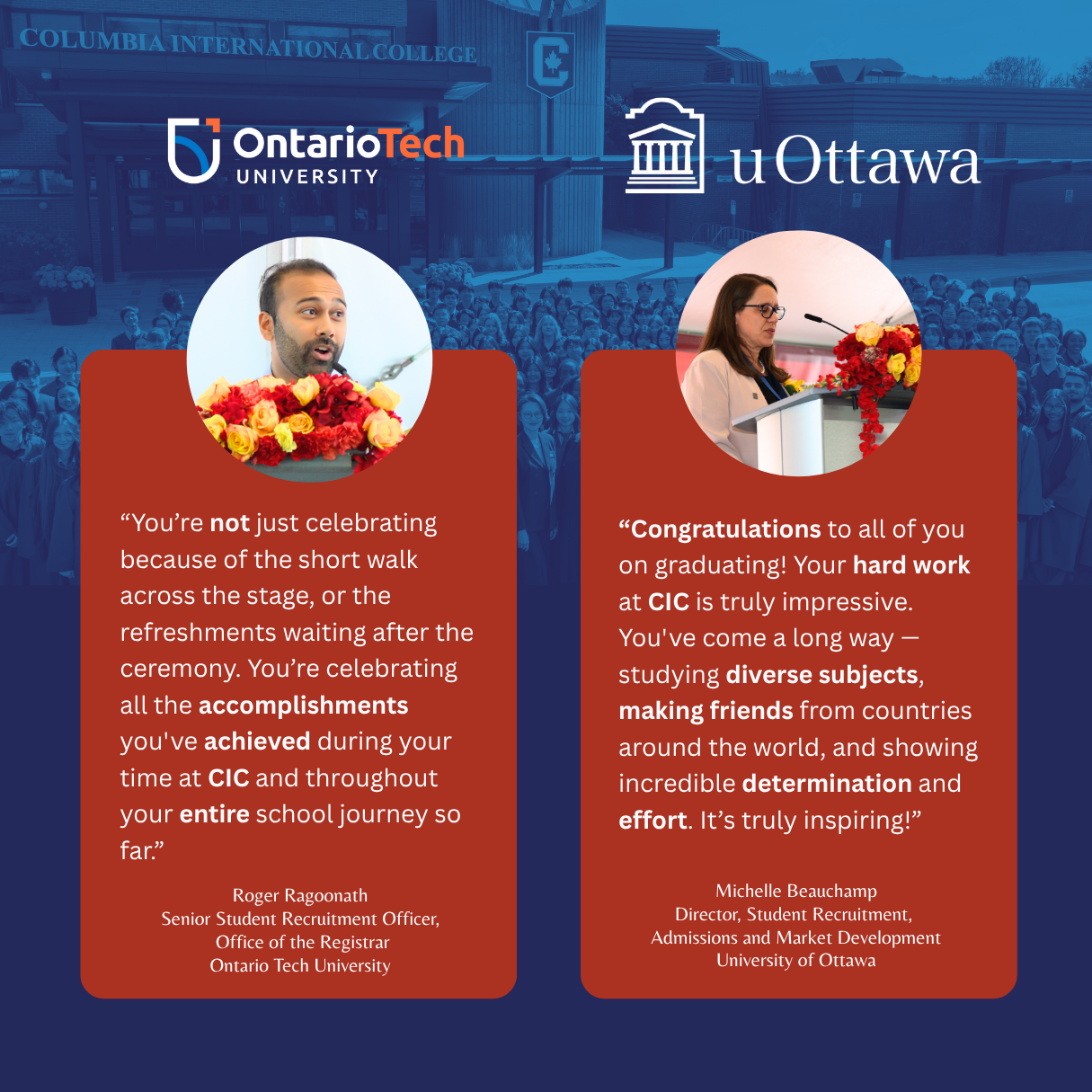 At Columbia International College’s May 2025 graduation ceremony, we were honored to welcome our distinguished guest speaker, Dr. Alexandra Gillespie, Vice-President of the University of Toronto and President of the U of T Mississauga Campus, along with admissions representatives from over a dozen of Canada’s top universities and community colleges. Their presence underscored strong support for CIC and our graduating class.
