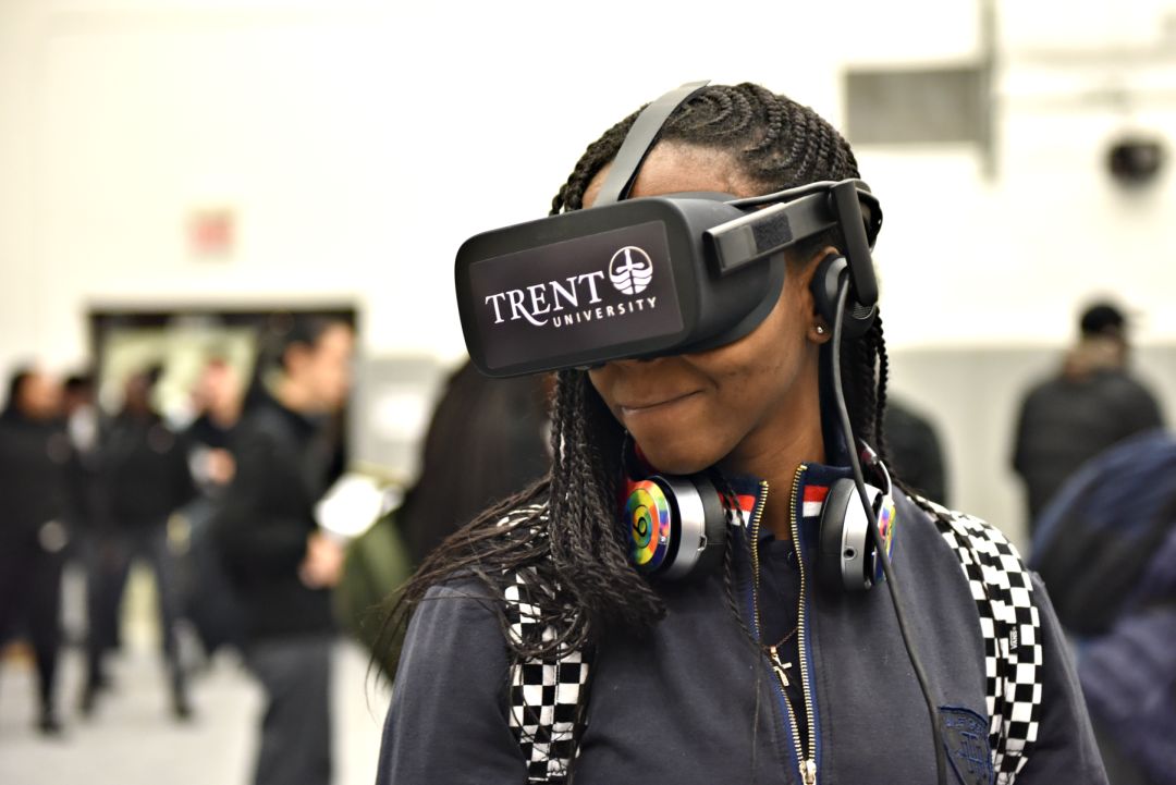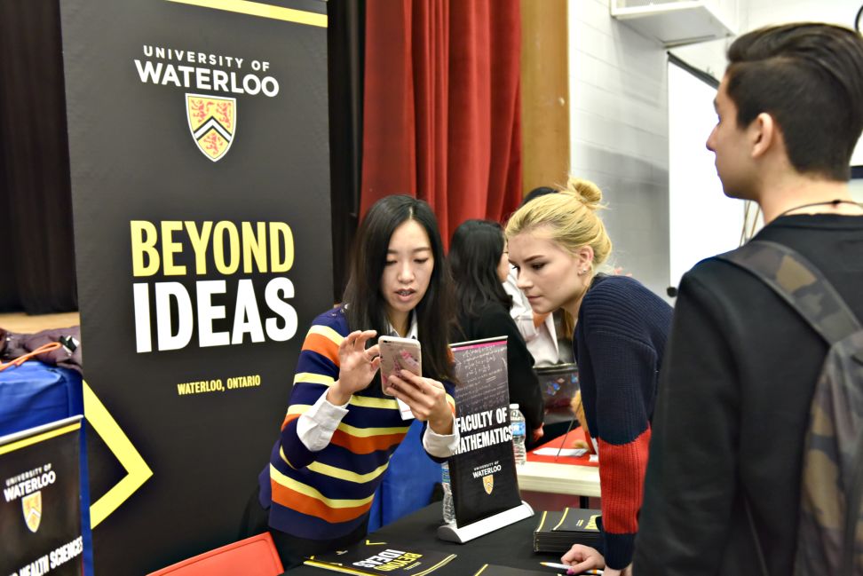 大学招生代表使出全身解数,利用多媒体吸引学生的眼球。川特大学(Trent University)带来了炫酷的虚拟现实(VR)眼睛,戴上后仿佛置身于校园,身临其境。