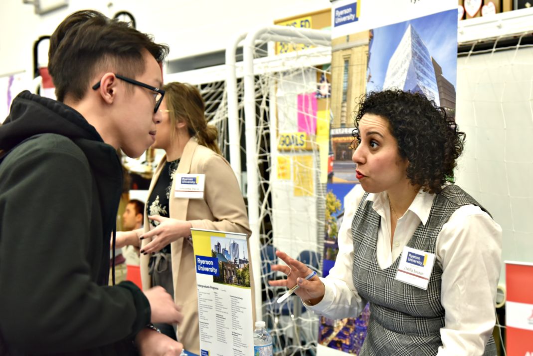 参加这次展会的大学首先在体育馆与学生集体见面。安省所有21所大学及几所来自外省大学的招生代表在现场讲解答疑。